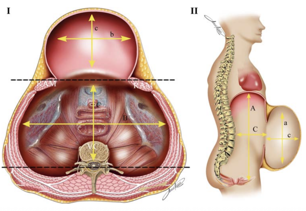A avaliação do conteúdo vai além da identificação de vísceras ou sinais de estrangulamento. Em hérnias complexas, utilizamos o Método de Tanaka para calcular objetivamente a perda de domicílio.